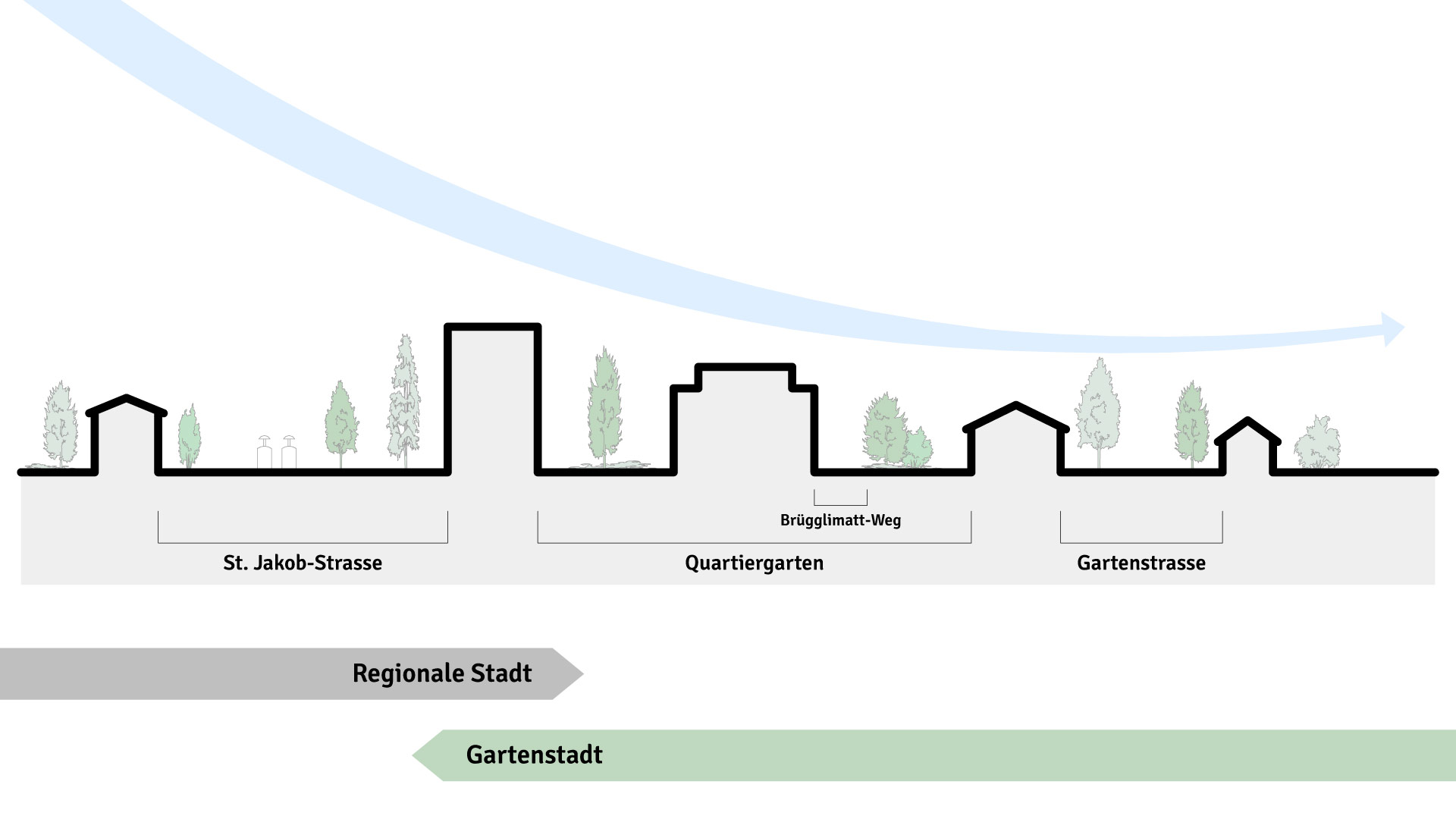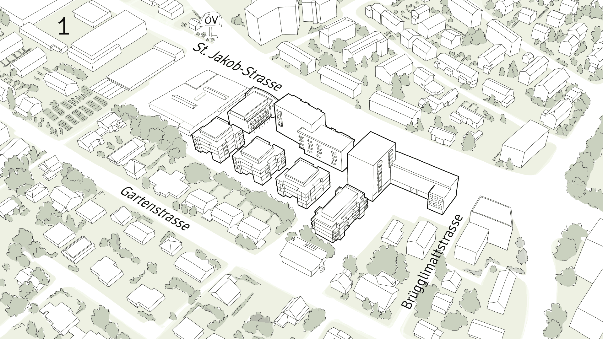 Das Projekt erstreckt sich entlang der St. Jakobs-Strasse über eine Länge von rund 200 Metern. Die Gebäude markieren zur Strassenseite hin eine klare Raumkante, während sie sich nach Norden an die kleinteilige Struktur des angrenzenden Einfamilienhausquartiers anpassen. Das Areal fügt sich in die bestehende Umgebung ein, führt deren Struktur weiter und bereichert es mit neuen Nutzungen und Angeboten. Basis für das Projekt Brügglimatt bildet eine Studie zur Weiterentwicklung der St. Jakobs-Strasse, welche die Eigentümerin zusammen mit der Gemeinde erarbeitet hat.
