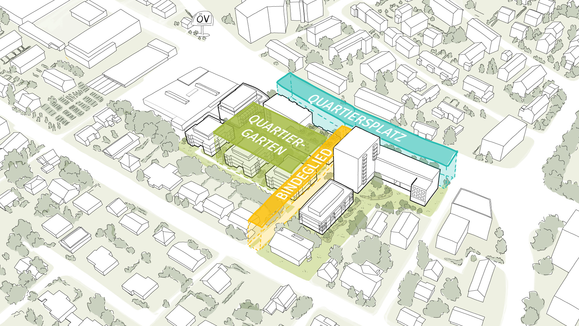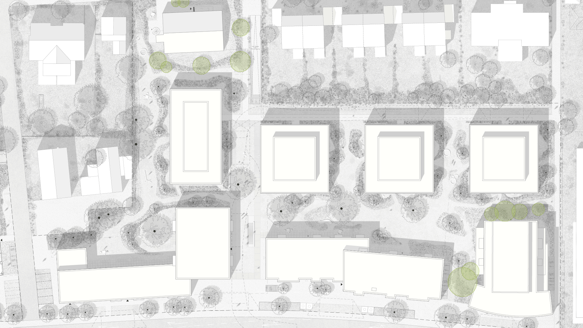Der Grünanteil im Quartier soll deutlich gesteigert werden. Durch die Verwendung heimischer Pflanzen entstehen vielfältige Lebensräume für Pflanzen und Tiere. Ein durchdachtes Drainagekonzept, Regenwasserrückhalteflächen und begrünte Dächer fördern die Verdunstung und tragen zur Kühlung des Areals bei. Zentrale Elemente des Freiraumkonzepts sind zudem grosskronige Bäume, die für Schatten und ein angenehmes Mikroklima sorgen.